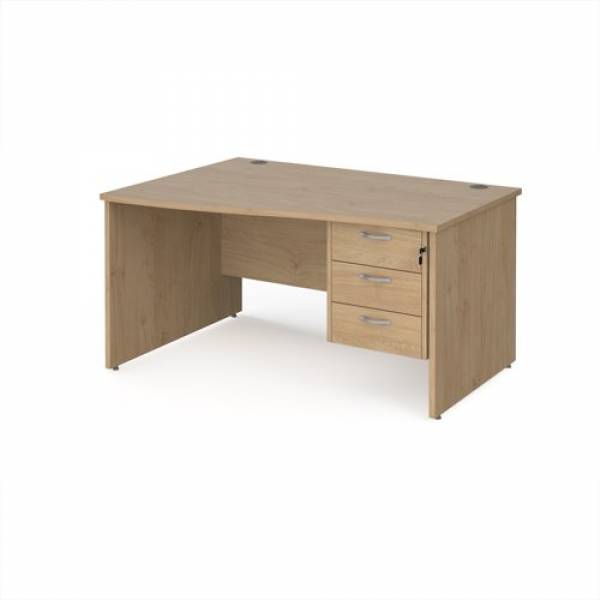 Maestro 25 left hand wave desk 1400mm wide with 3 drawer pedestal - kendal oak top with panel end leg
